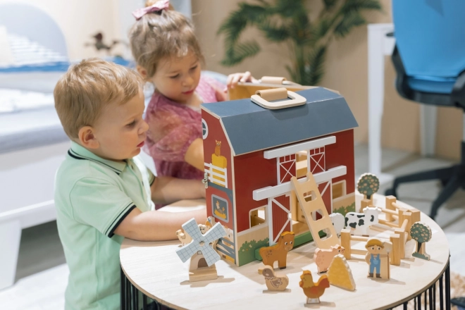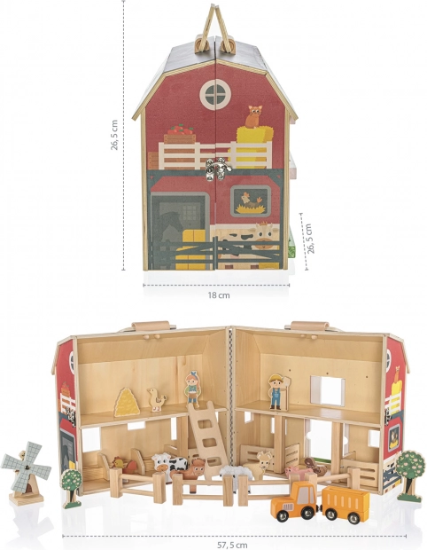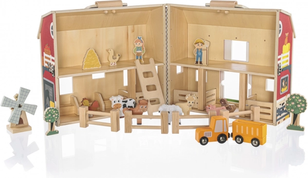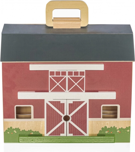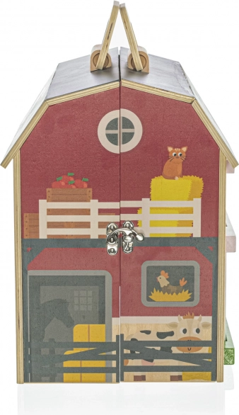 Une magnifique petite ferme en bois avec poignée, permettant un transport facile et le jeu partout.
