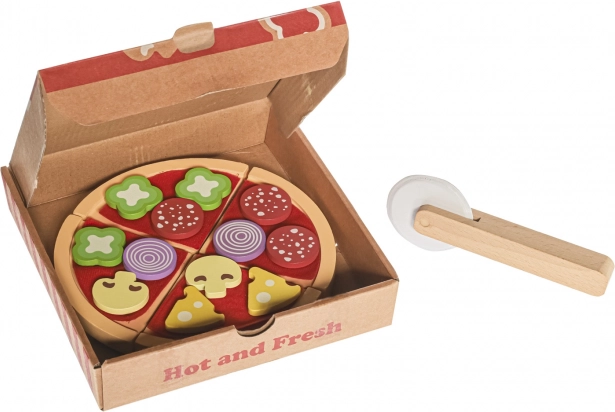 Jouet en bois pour enfants représentant un set de pizza réaliste, qui apporte du plaisir et favorise la créativité des enfants. Ce jouet sûr est composé de 20 éléments, dont une roulette à pizza en bois et des ingrédients avec scratch. Les pièces sont de couleurs vives, sans arêtes vives et fabriquées en bois naturel de qualité, peint avec des couleurs non toxiques.