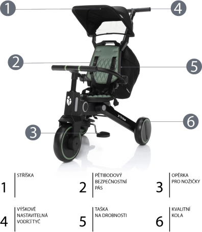 Le modèle X Trike se distingue par une structure pliable très compacte, qui se loge aisément dans une voiture ou une armoire. Grâce à la possibilité de rouler face ou dos à la route et à la barre de guidage réglable en hauteur, chaque sortie devient un jeu d’enfant. Un sac amovible pratique et un sac de transport inclus maximisent l’utilité au quotidien.