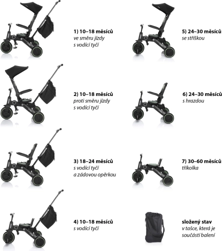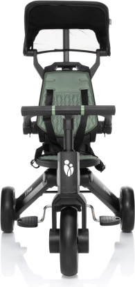 Le tricycle est pliable et compact, il tient donc dans le coffre de la voiture comme dans une petite entrée. Un sac amovible et un étui de transport facilitent les voyages. La sécurité est assurée par les harnais 5 points, la barre réglable et le frein sur les roues arrière.