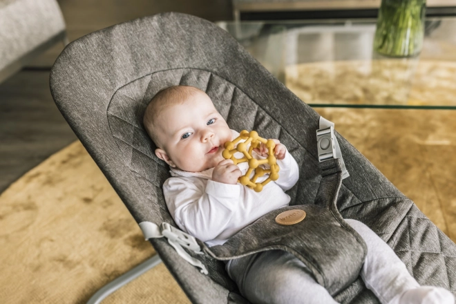 L’anneau de dentition est fabriqué en silicone alimentaire sûr, non toxique et résistant à la casse. Pour les tout-petits, le silicone est plus naturel que le plastique ou le métal. Grâce à sa forme, il tient parfaitement même dans la plus petite des mains et l’enfant peut le saisir facilement sous n’importe quel angle. La forme de l’anneau stimule la motricité des mains, en particulier la coordination main-œil. Les différentes textures stimulent les gencives sollicitées et sensibles lors de la poussée dentaire.