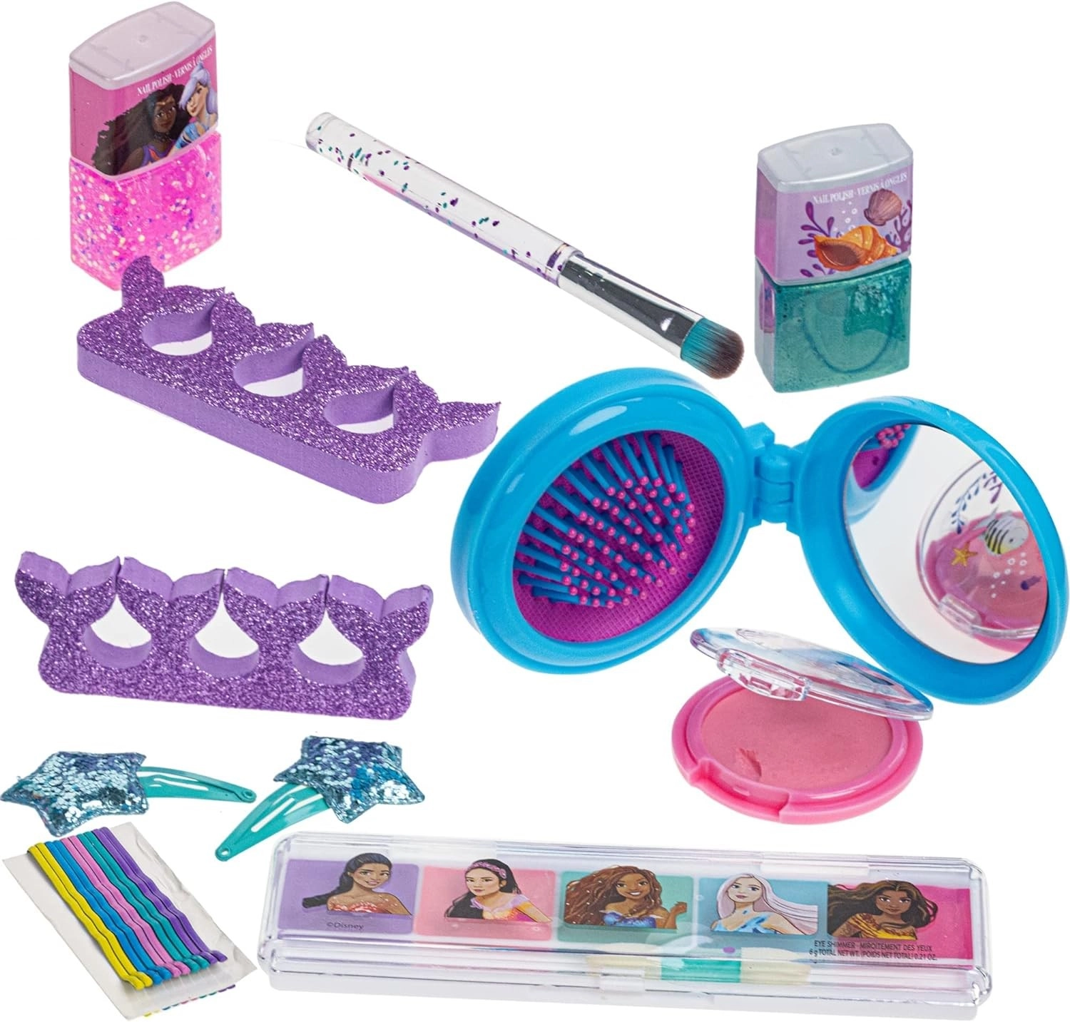 - 2 vernis à ongles non toxiques pelables, palette de fards à paupières, blush, paillettes pour le corps, 2 barrettes, 10 pinces, applicateur de maquillage, brosse pliante pour cheveux avec miroir