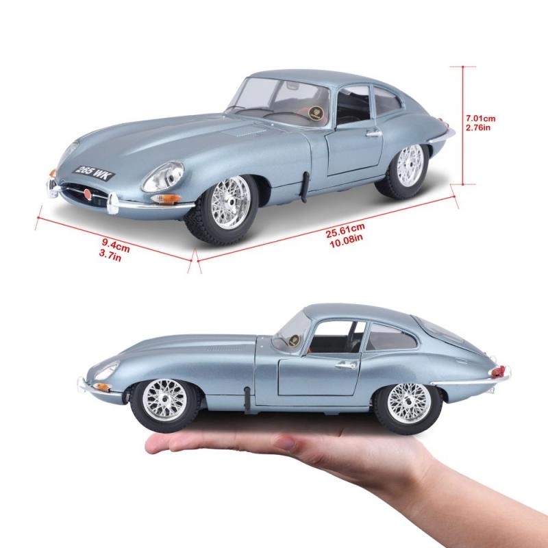 Modèle réduit métallique 1:18 Bburago 18-12044 Jaguar E-type Coupé, pas seulement pour les collectionneurs. Il possède des portes et un capot ouvrants, et la direction des roues via le volant est pleinement fonctionnelle. La couleur du modèle est bleu argent métallisé.