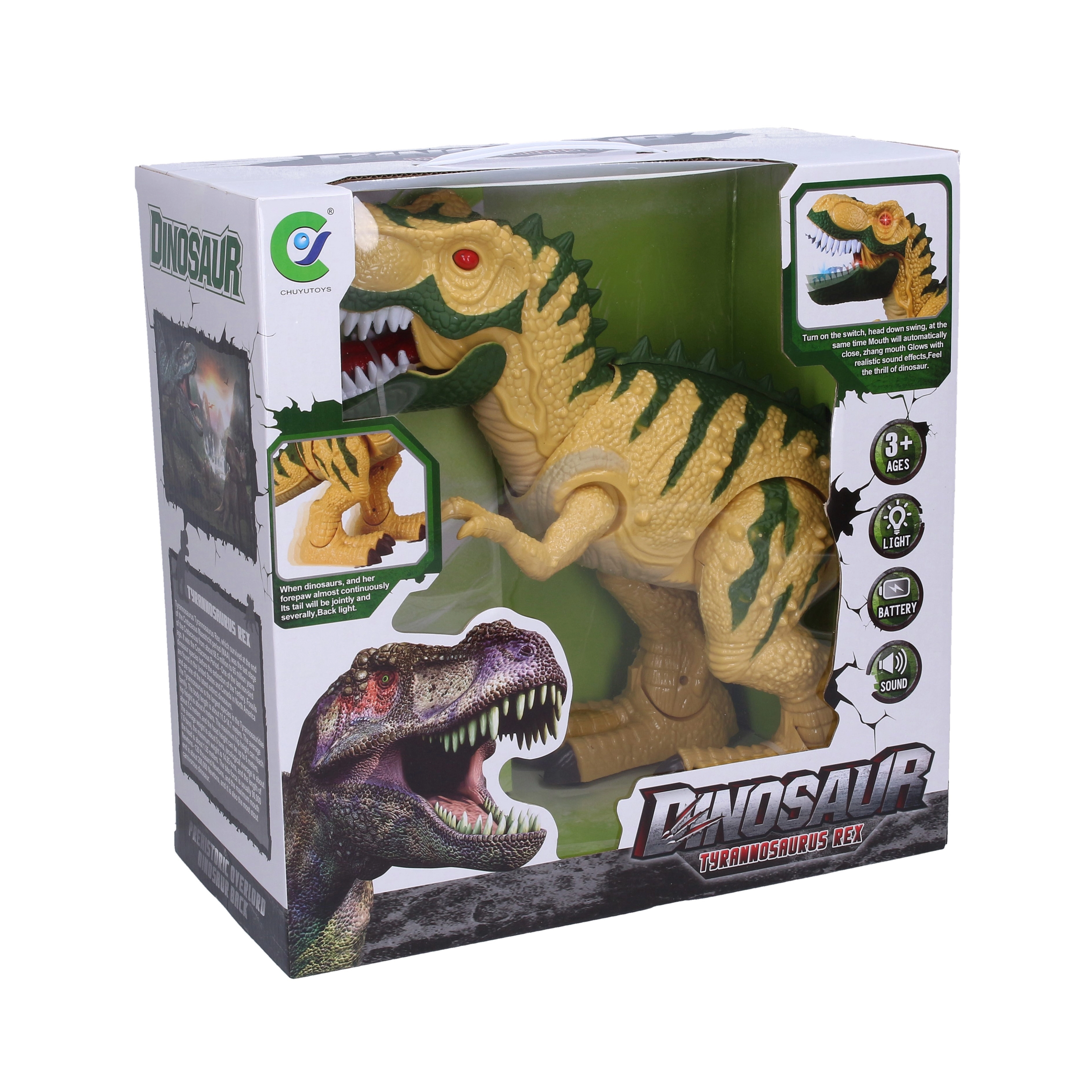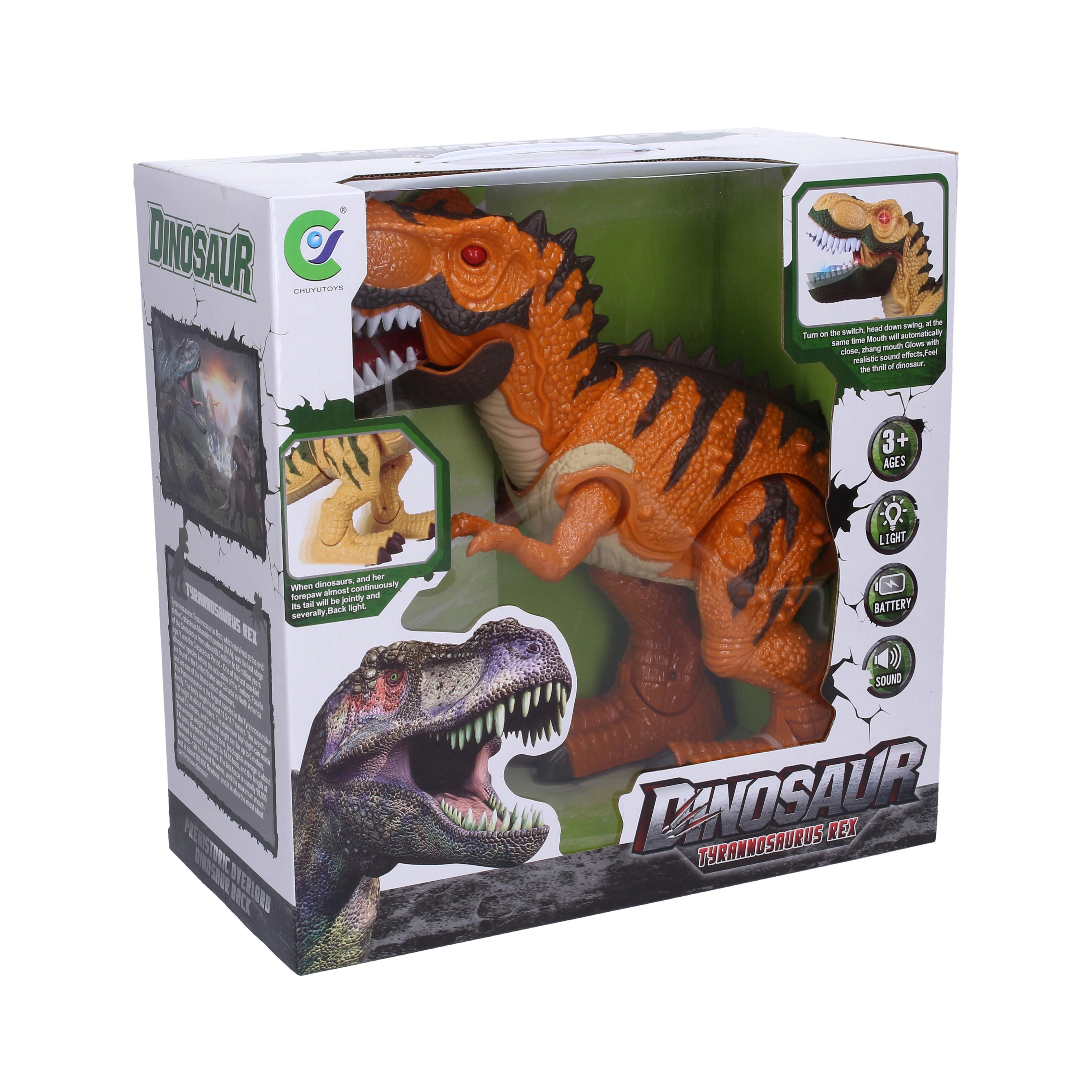 • Mouvements et effets – le dinosaure marche, ouvre la mâchoire et émet des sons.