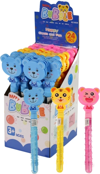 Le petit embout intégré au bouchon est toujours à portée de main, et le mélange de couleurs (bleu, rose, jaune) avec ourson, tigre et petit singe plaira à tous les petits fans de bulles. Produit adapté dès 3 ans. Pour un achat facile et le réassort, nous proposons la vente uniquement par carton complet de 24 pièces.