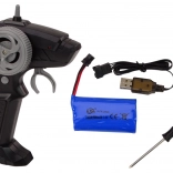 La voiture est alimentée par une batterie 3,7 V 50 mAh incluse dans le kit. Un chargeur est fourni avec la batterie.