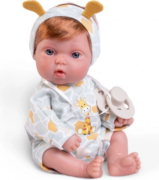 La poupée est habillée d’une adorable tenue à motif girafe, complétée par un bandeau avec de petites oreilles jaunes et une tétine, ce qui renforce son aspect réaliste.