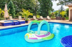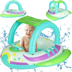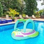 L’auvent pratique protège du soleil et permet un jeu dans l’eau plus long et plus sûr, sans surchauffe.