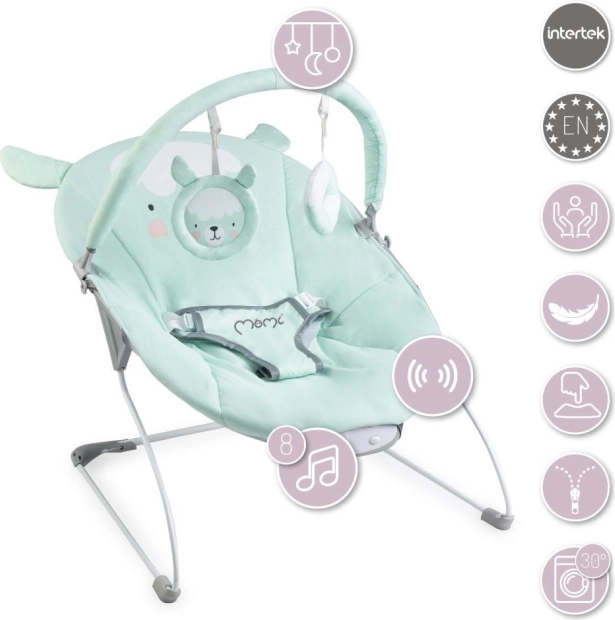 « Alors je reste ici bien allongé·e à écouter de la musique et toi, fais ce dont tu as besoin, d’accord ? » C’est un excellent plan avec le MoMi GLOSSY ! Un transat léger, facile à déplier, avec un rembourrage doux, un dossier ergonomique et une structure stable. De jolies jouets, 8 mélodies douces et de légères vibrations offriront à l’enfant beaucoup de divertissement puis l’emmèneront vers un doux sommeil.