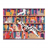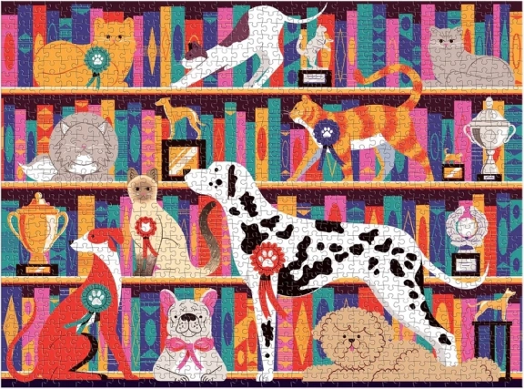 Le puzzle présente des illustrations vivantes de chiens et de chats d’exposition sur des étagères garnies de trophées, ce qui apporte une nouvelle dimension au jeu.