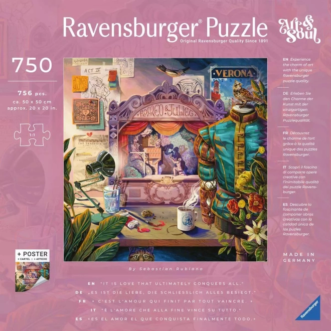 Plongez dans une histoire romantique avec l’édition RAVENSBURGER Art & Soul, où se rencontrent art, qualité et plaisir d’assemblage. Le puzzle carré Roméo et Juliette au format 50 × 50 cm se distingue par des pièces découpées avec précision qui s’emboîtent parfaitement et par une réalisation artistique unique.