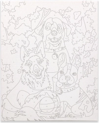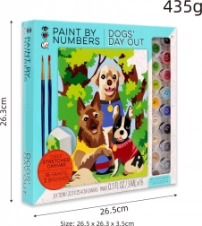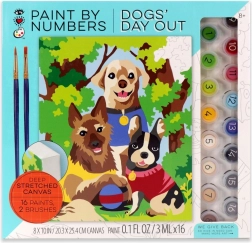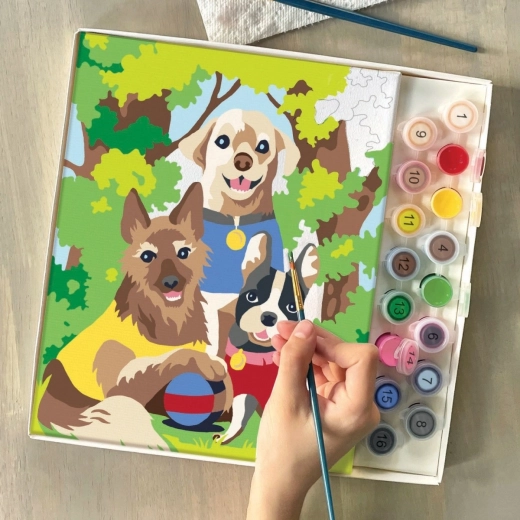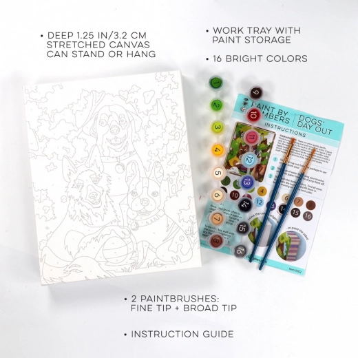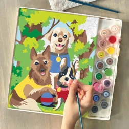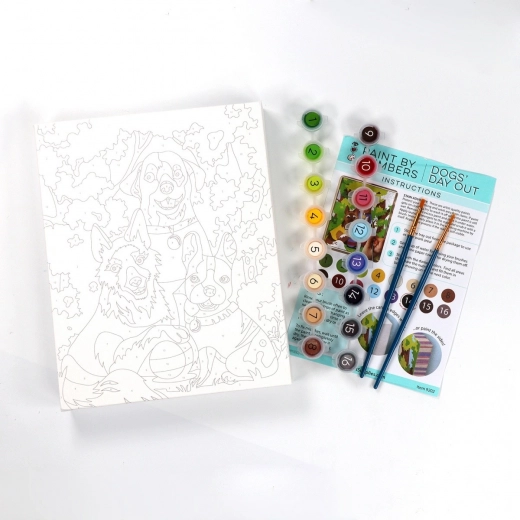 Ce kit de peinture par numéros vous aide pas à pas à créer une scène colorée de trois chiens en promenade. Les zones numérotées sur la toile correspondent aux numéros sur les pots de peinture, vous savez donc exactement quelle teinte appliquer où. La peinture est relaxante, ludique et adaptée aux débutants comme aux enfants.
