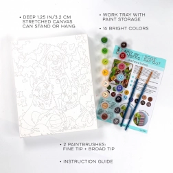 Le coffret contient tout le nécessaire : une toile tendue profonde (8 × 10 pouces), 16 peintures acryliques en pots, 2 pinceaux et un guide simple. Il suffit d’ouvrir la boîte et de commencer à peindre.