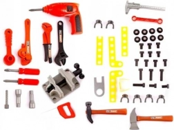 L'ensemble comprend plus de 50 pièces: perceuse sans fil, étau, scie, marteau, hache, pince, maillet en caoutchouc, tournevis, clé et autres accessoires comme les vis, écrous, connexions et crochets.