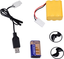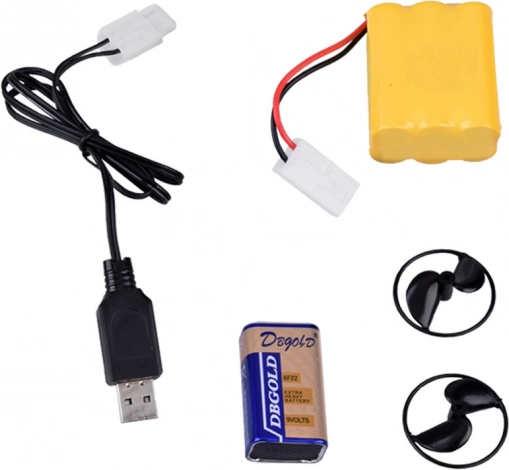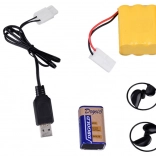 - Kit complet : télécommande en forme de gouvernail, accumulateur, pile 9 V, câble USB, hélice de rechange et support.