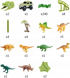 8 figurines de dinosaures (2 grandes), 4 arbres, 2 tunnels en forme de tête de dinosaure, 12 pièces pour 2 ponts