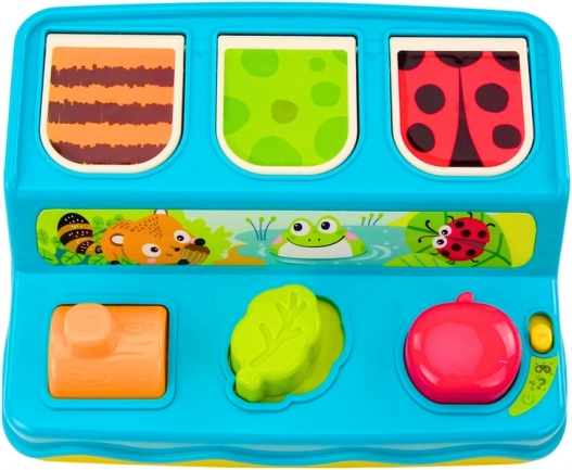Le jouet se compose d’une base colorée et solide, sur laquelle sont placées différentes formes et boutons. Chaque forme représente un animal différent et les boutons servent à les activer. Lorsque l’enfant appuie sur une forme ou la déplace, l’un des trois petits animaux surgit, ce qui encourage le tout-petit à poursuivre son exploration.