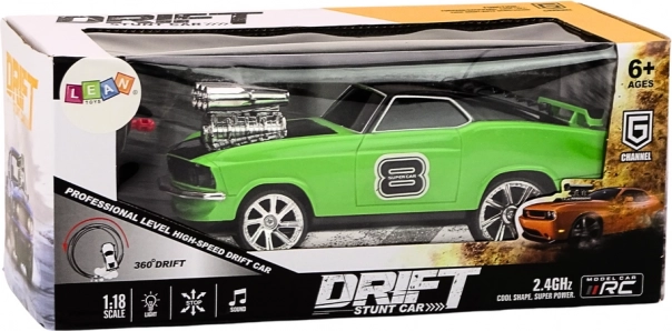 Profitez de glissades énergiques dans les virages serrés, de changements de trajectoire rapides et de pirouettes spectaculaires – le tout grâce à une conception dédiée au drift fluide et à une direction stable. La voiture séduit par son look vert affirmé avec des détails sportifs et des LED saisissantes qui ajoutent de l’atmosphère à chaque course.