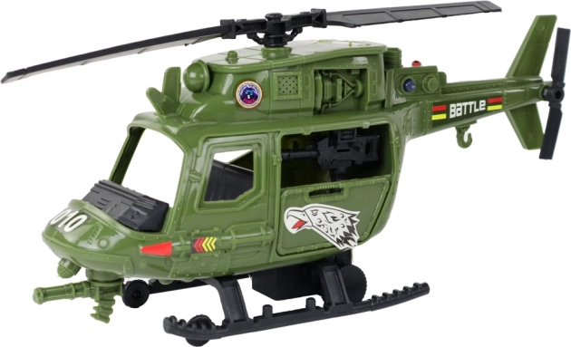 Hélicoptère de combat vert avec cockpit transparent et marquages détaillés, apportant action et réalisme au jeu. Les effets lumineux et sonores renforcent l’ambiance de chaque mission.