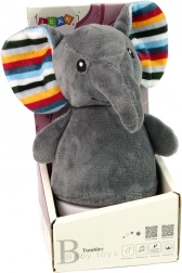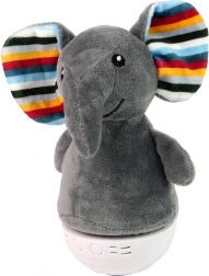 L'éléphant possède deux boutons de commande en dessous - un pour allumer le jouet et un autre pour régler la mélodie. Les mélodies sont conçues pour être calmes et apaisantes. La housse protectrice en forme d'éléphant peut être facilement retirée et lavée, assurant ainsi l'hygiène du produit.