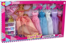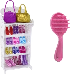 Le set comprend non seulement la poupée, mais aussi une armoire blanche élégante avec 12 paires de chaussure à choix. La poupée a à disposition 5 robes de soirée différentes en blanc, violet, rose foncé, bleu et rose clair avec des éléments scintillants. Le pack comporte également 2 paires de boucles d'oreilles argentées, 2 sacs à main (violet et doré), 3 colliers, une barrette et une brosse à cheveux.