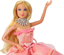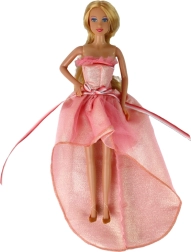 Poupée avec de longs cheveux blonds et des yeux bleus, habillée d'une robe rose avec un haut bouffant et un nœud.