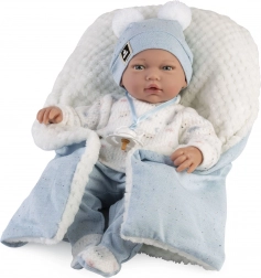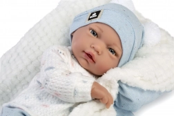 Poupée réaliste bébé avec corps en tissu souple, facilement positionnable. Les bras et les jambes sont attachés par des articulations, ce qui permet à la poupée de s'asseoir. Livré avec une sucette comme accessoire.