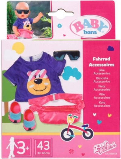 Partez à vélo avec votre poupée avec style et en toute sécurité. Le set d’accessoires de cyclisme pour BABY born 43 cm comprend un t-shirt confortable au motif ludique, une banane pratique pour les petits objets et des lunettes contre le soleil. Les chaussures antidérapantes tiennent fermement au pied de la poupée, pour être prête à toute aventure.