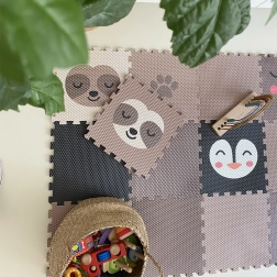 Ce charmant Minideckfloor à motif de paresseux apporte de la gaieté et de la chaleur à l’intérieur. Le fond marron avec un paresseux crème est polyvalent, s’intégrant parfaitement aux chambres modernes comme scandinaves. La surface est agréable au toucher, adaptée aux pieds nus et aux jeux quotidiens.