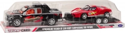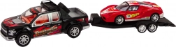 Le pickup aux grandes roues noires tracte fiablement la remorque avec la voiture de sport et, grâce au mécanisme à inertie, démarre vers l’avant sans piles après tension. La remorque détachable permet de changer rapidement de jeu – les enfants peuvent transporter la voiture ou jouer avec chaque modèle séparément. La voiture de sport rouge séduit par ses lignes élégantes et se charge et décharge aisément.