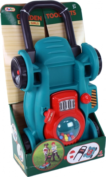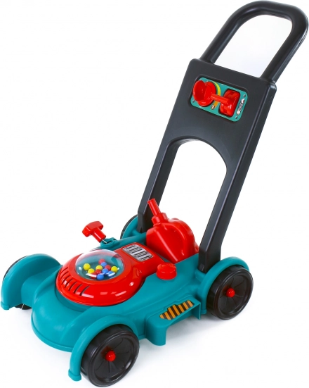 La tondeuse a une base turquoise et une poignée rouge, apportant un aspect joyeux et attrayant au jouet.