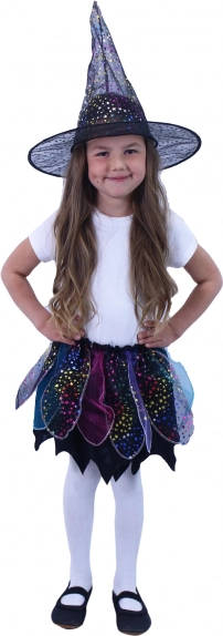 Nous présentons un costume magique pour petites sorcières qui fera naître un sourire sur le visage de chaque fillette. Ce costume combine un chapeau de sorcière noir avec une jupe ornée de détails colorés rappelant des fleurs écloses.