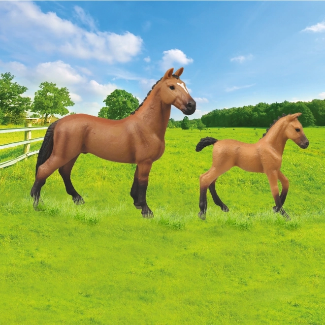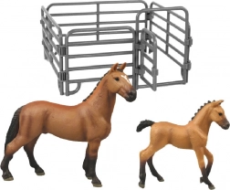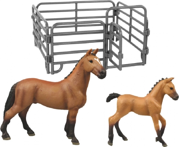 Ensemble idéal pour les amateurs de chevaux contenant une figurine de cheval et de poulain dans une magnifique couleur marron avec une tache blanche, complétée par un enclos.