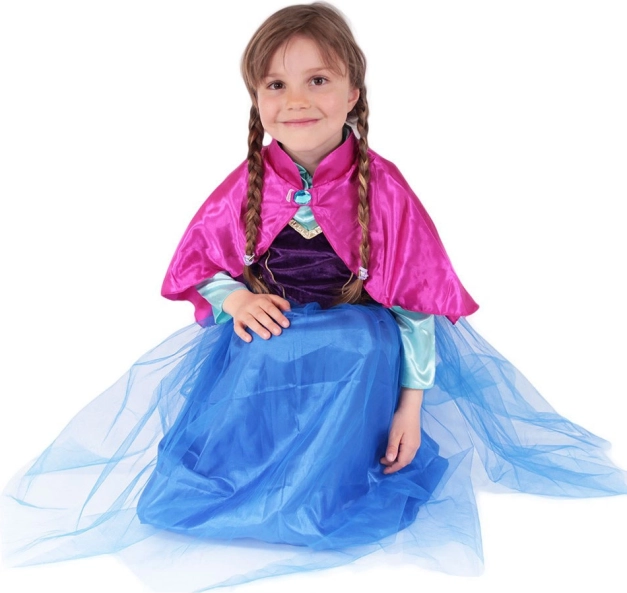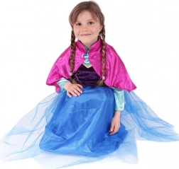 Superbe costume de princesse d’hiver pour petites filles, inspiré d’une héroïne adorée. En taille M pour 6–8 ans (117–128 cm), il propose une robe noir et bleu avec finitions dorées et une cape en satin rose ornée d’un « cristal » bleu. L’emballage ECO pratique économise de la place et respecte la nature.