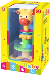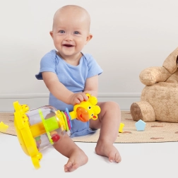 Un manège multicolore en forme de girafe qui amuse même les tout-petits : en pressant la tête, les billes colorées se mettent à tourner, sautillent et émettent un bruit de hochet. Un contrôle mécanique simple, sans piles, qui favorise le développement de la motricité fine et la coordination œil-main.