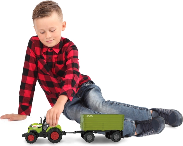 Découvrez un plaisir de ferme réaliste avec ce tracteur compact avec remorque, idéal pour les petites mains. La remorque se détache et s’ouvre facilement, rendant le transport de “chargements” un jeu d’enfant. Grâce à la roue libre, le tracteur se manie aisément et roule sans à-coups sur les surfaces planes.