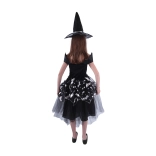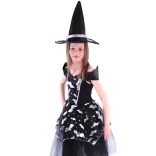 Ce magnifique costume de sorcière avec motifs de chauves-souris est un excellent choix pour les filles de 6 à 8 ans mesurant 117 à 128 cm. La robe noire à jupe vaporeuse est décorée d’éléments argentés, et le chapeau parfaitement assorti avec un élégant ruban argenté complète l’ensemble.