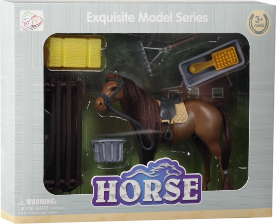 Ce set avec un cheval brun est idéal pour les enfants qui aiment les animaux et les jeux de ferme. Le cheval a une crinière sombre, une selle et, grâce à la brosse incluse, les enfants peuvent en prendre soin comme d’un vrai. Un enclos pliable est également inclus pour rendre le jeu encore plus authentique.