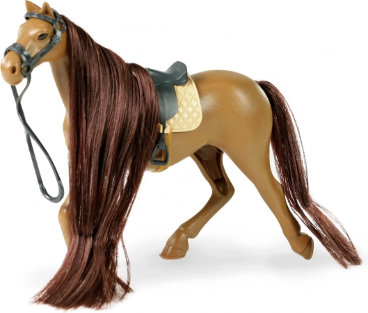 - Apparence réaliste avec crinière sombre et selle