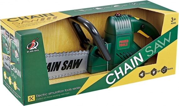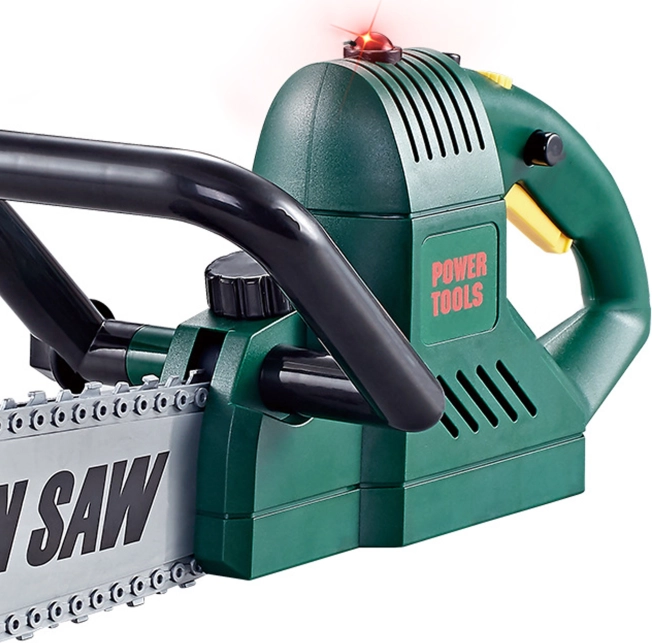 Tronçonneuse pour enfants réaliste qui, en appuyant sur un bouton, émet un son authentique, allume une lumière et fait tourner une chaîne comme une vraie tronçonneuse. Un excellent jouet pour les petits bricoleurs.
