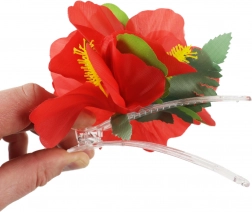 Cette barrette à cheveux fleurie apporte de l'exotisme directement à votre style. Avec ses fleurs rouges vives et ses feuilles vertes, vous deviendrez la reine de chaque événement, qu'il s'agisse d'une fête sur la plage, d'une soirée hawaiienne ou d'une célébration au bord de la piscine.