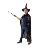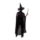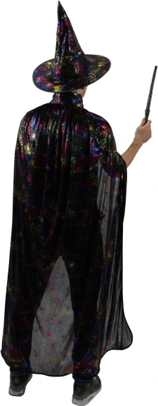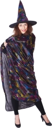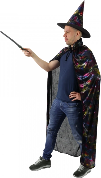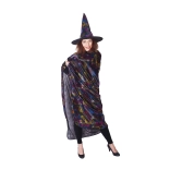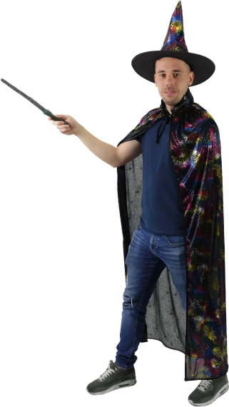 Ce costume minutieusement réalisé est idéal pour tous ceux qui souhaitent vivre des soirées magiques dans un style dramatique. Il comprend une magnifique cape avec des motifs colorés de toiles d’araignée et un chapeau assorti qui confère à l’ensemble une véritable ambiance enchantée.