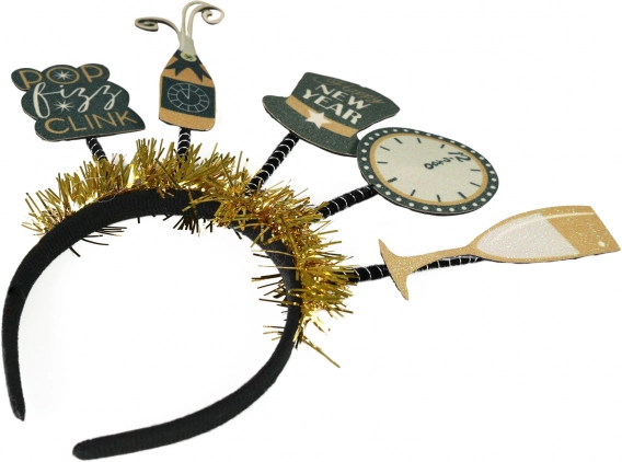 Le serre-tête apporte une touche d’humour et d’originalité aux fêtes de Nouvel An avec les inscriptions « Pop Fizz Clink ».