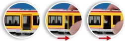 Un levier sous les portes permet leur ouverture et fermeture manuelles – parfait pour jouer aux montées et descentes des passagers. Grâce à sa taille de 20 cm, le tramway tient bien en main et trouve aussi sa place dans une collection de modèles.