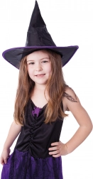 La robe noir‑violet avec motif toile d’araignée et le chapeau assorti créent une tenue de sorcière parfaite en un instant.