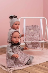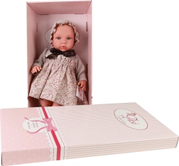Martina a un visage délicat sans cheveux, des yeux acryliques bleus fixes bien marqués et des cils appliqués. Sa tenue comprend une jolie petite robe avec fermeture à scratch dans le dos, un bonnet à nouer et de doux chaussons – un ensemble idéal pour le jeu quotidien ou comme cadeau. La marque familiale ASI, en Espagne, se consacre depuis plus de 50 ans à une fabrication artisanale soignée, avec une attention constante aux détails, à la qualité et à la sécurité.