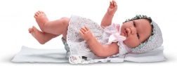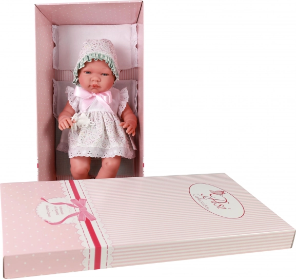 La poupée est joliment habillée d’une robe blanche en dentelle avec bonnet et est livrée avec un coussin, une couette et une tétine sur chaîne qui peut être placée dans la bouche. Parfaite pour le jeu de rôles, elle développe l’empathie, la motricité fine et l’imagination.