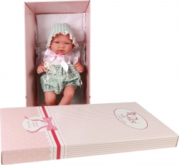 Pablo est vêtu d’une combinaison d’été sans manches vert et blanc à jambes courtes, décorée de dentelle blanche, complétée par un bonnet à nouer. Il est allongé sur un coussin moelleux avec couette et dispose d’une tétine sur chaînette que l’on peut insérer dans la bouche, où elle tient fermement. Le fabricant ASI (Asivil) est une marque familiale espagnole avec plus de 50 ans de tradition, privilégiant un savoir‑faire 100 % local et des standards européens stricts.