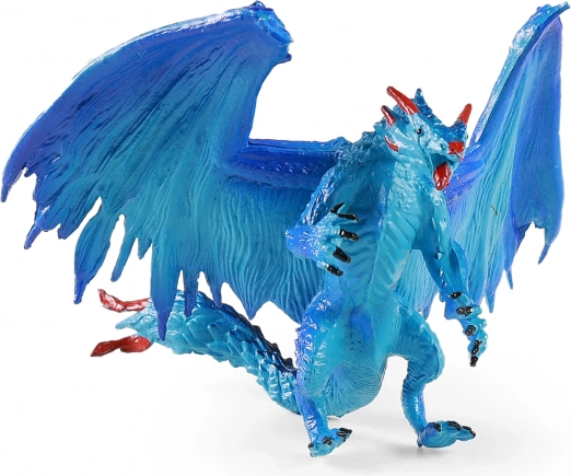 Dragon bleu détaillé avec de grandes ailes déployées et des accents rouges sur le visage et la queue.