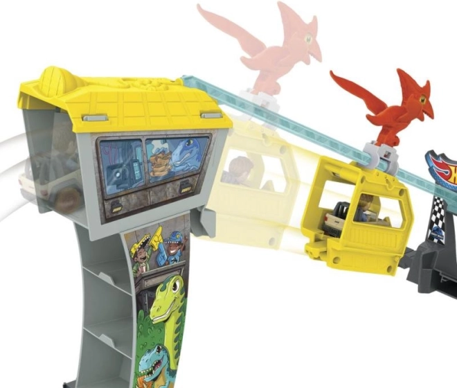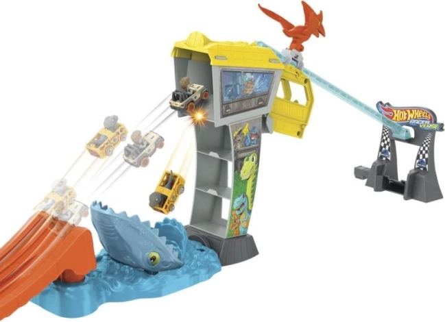 La piste de course Hot Wheels Jurassic World vous transporte dans un univers rempli de vitesse et de frissons. Ce set comprend :